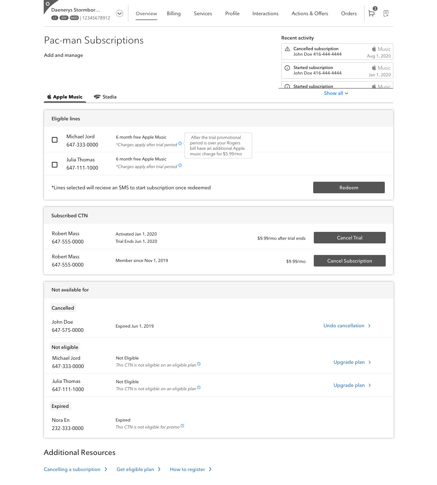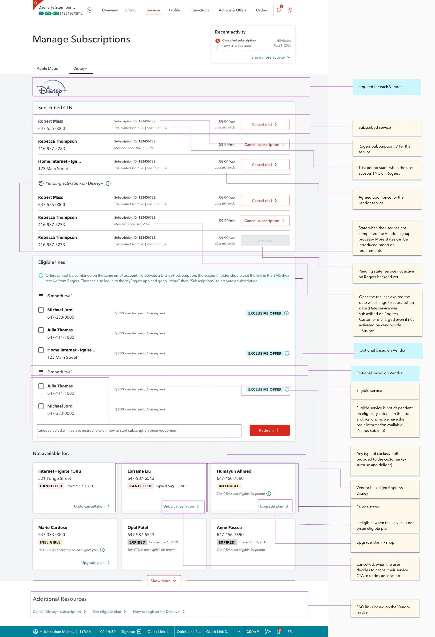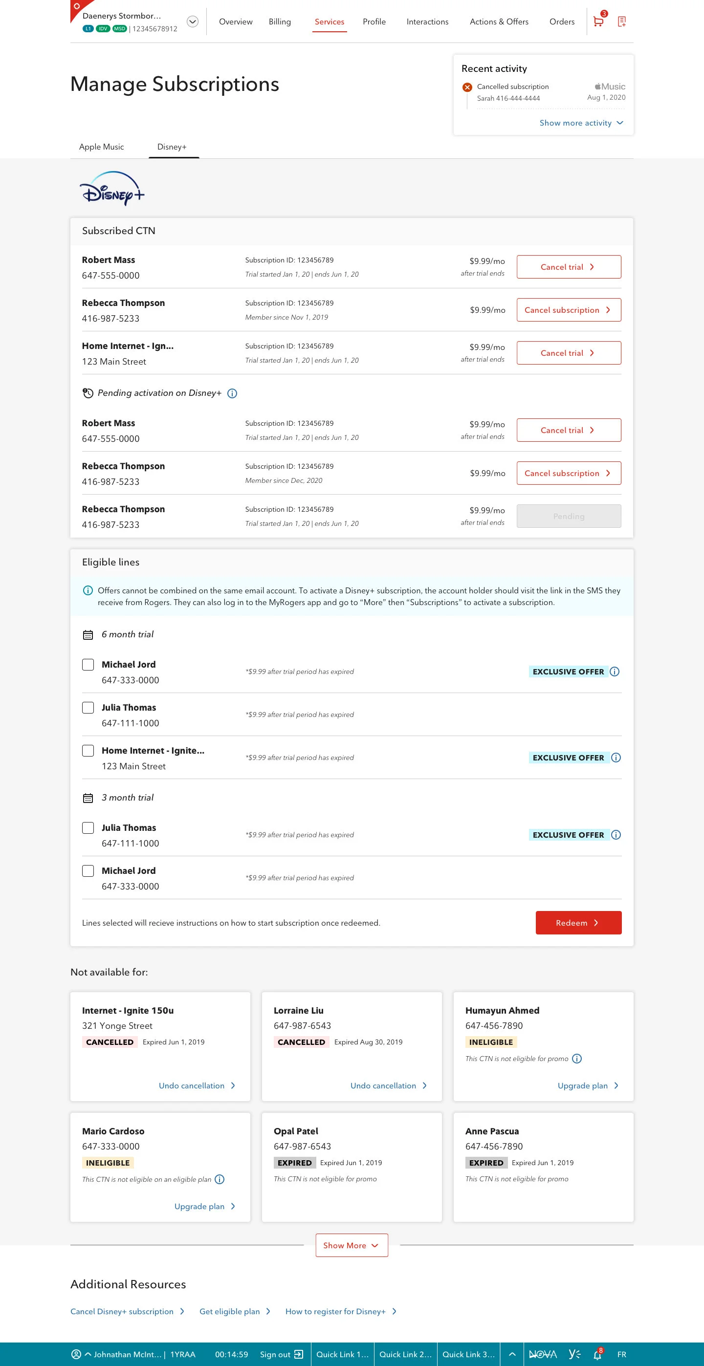 For this project, I worked with a small design team and numerous stakeholders to create the page and flow for our Care (Call Centre) and Retail store reps to add vendor third party subscription services to customers’ accounts. I also worked closely on the customer-facing page where customers were able to self-serve and activate their own subscription service.